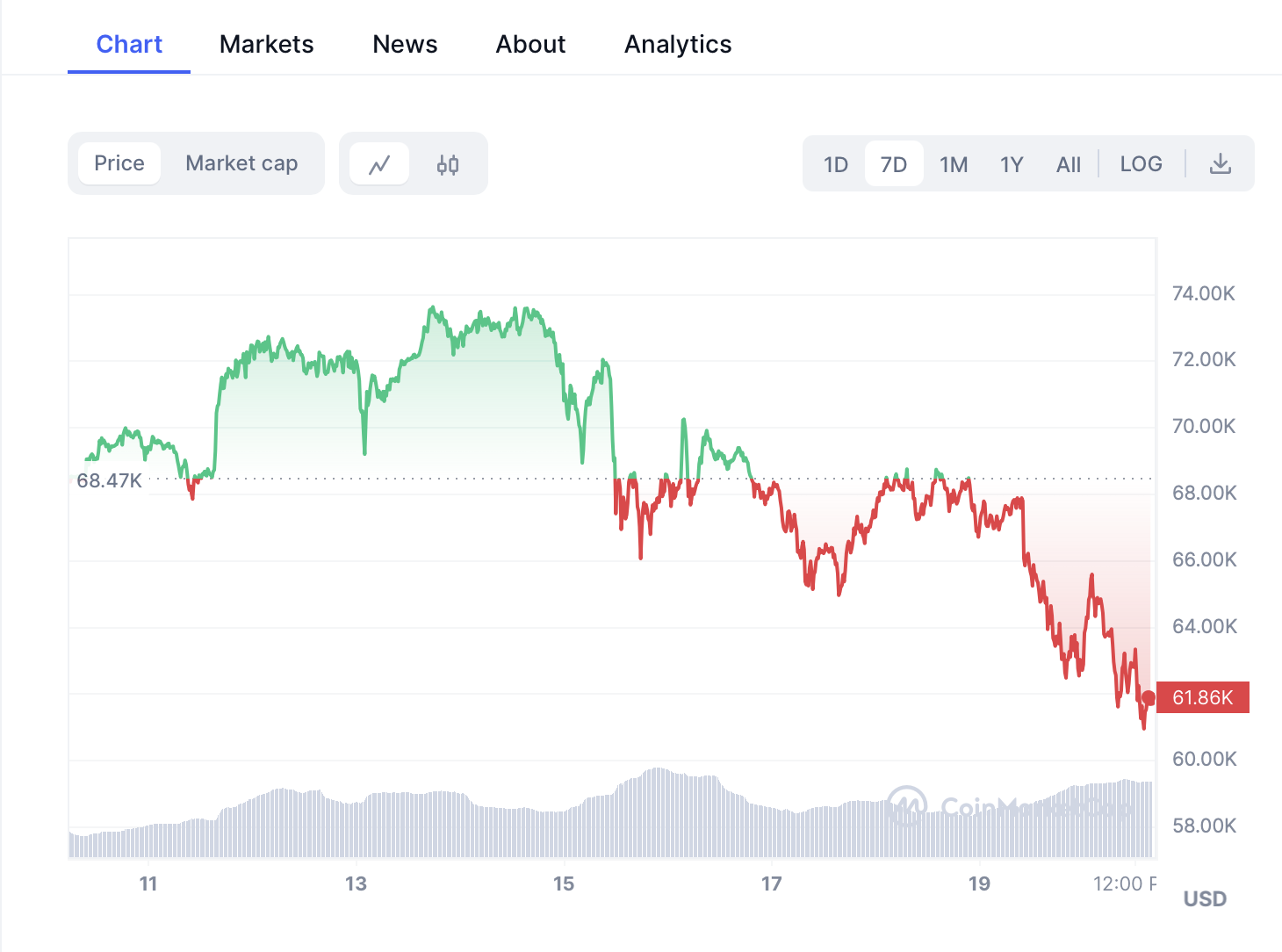 3月20日,比特币价格一度跌破6.1万美元/枚,截至下午3点,比特币报价6.17万美元,较上周创下的7.35万美元历史高位回落15%。比特币市值也随之回落到1.22万亿美元。
