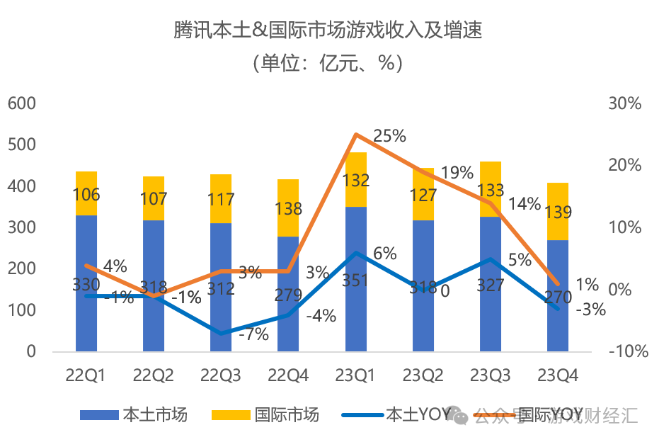 单看游戏业务,23Q4腾讯游戏收入409亿,同比下降2%。