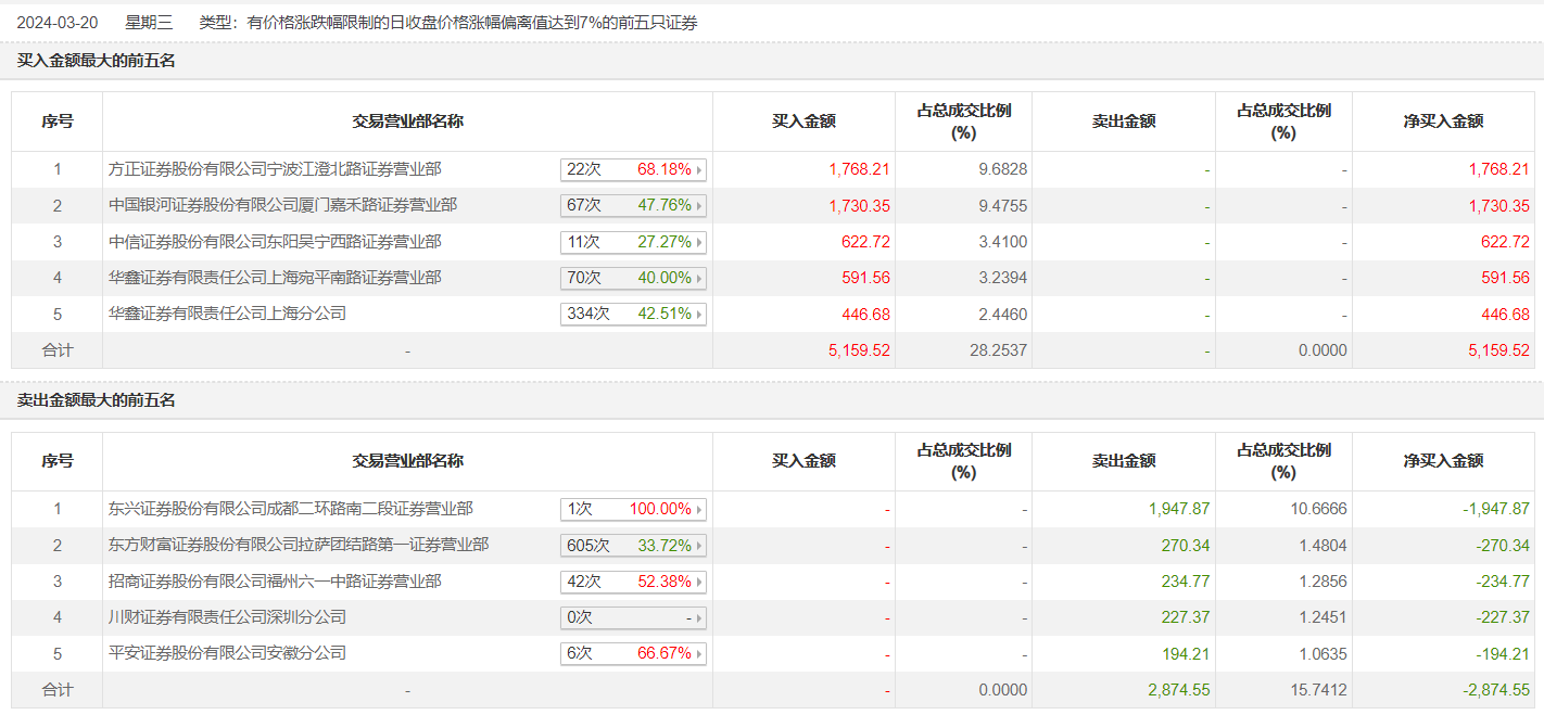 鑫科材料3月20日涨停,龙虎榜数据显示,上榜营业部席位全天成交8034.08万元,占当日总成交金额比例为43.99%。其中,买入金额为5159.52万元,卖出金额为2874.55万元,合计净买入2284.97万元。