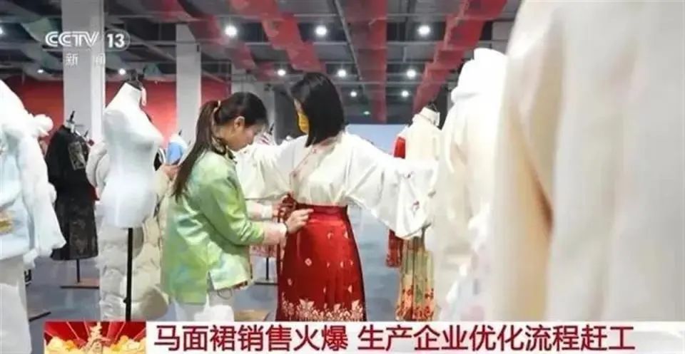 曹县电子商务服务中心数据显示,仅今年春节期间,该县以马面裙为主的龙年拜年服饰销售额超过3亿元。该中心主任张龙飞介绍了马面裙走红的过程:2022年7月,国际知名品牌迪奥发布一款售价折合人民币2.9万元的中长半身裙,因其外形酷似马面裙,有网友指出该款产品设计疑似抄袭马面裙。此事在短时间内引发大量关注,马面裙也走进公众视野。