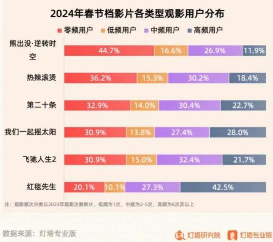 从购票用户的年龄来看,《红毯先生》的受众主要是年长人群,而从购票用户的观影频率来看,《红毯先生》的受众超过40%属于每年观影6次以上的高频用户,即资深影迷。