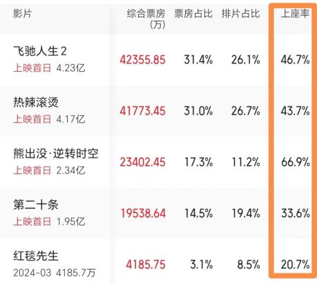 《红毯先生》在初一的上座率为20.7%,不及《热辣滚烫》《飞驰人生2》的一半,更是只有《熊出没·逆转时空》的30%。