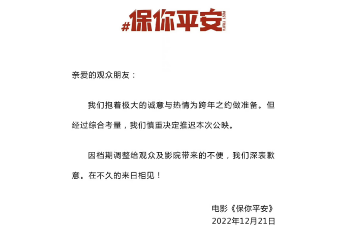但随着疫情管控政策变化,《保你平安》在2022年12月21日宣布撤档,等疫情防控态势明朗以后,宣布改期到2023年3月上映。
