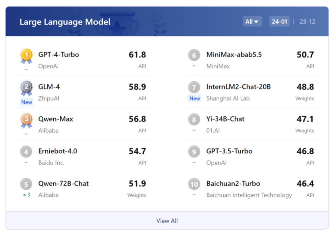 1月30日,上海人工智能实验室推出的大模型开源开放评测体系司南(OpenCompass2.0),发布了2023年度大模型评测榜单,榜单显示,整体技术能力居于GPT4与GPT3.5之间的大模型数量,已多达7个,其中不乏国产大模型身影。