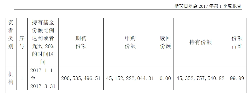 浙商日添金货币基金2017年第一季度财报显示,在这期间,一家机构申购份额达到约452亿份,直接助推了该基金规模大涨,份额占比达到惊人的99.99%。