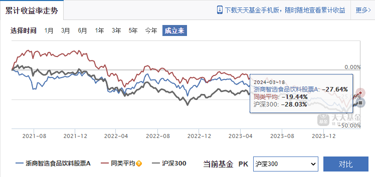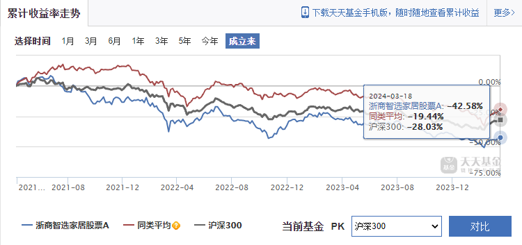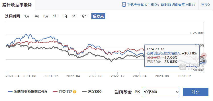 天天基金网显示,截至2024年3月18日,浙商智选食品饮料A、浙商智选家居A、浙商创业板指数增强A成立以来的亏损分别高达28%、43%、30%。