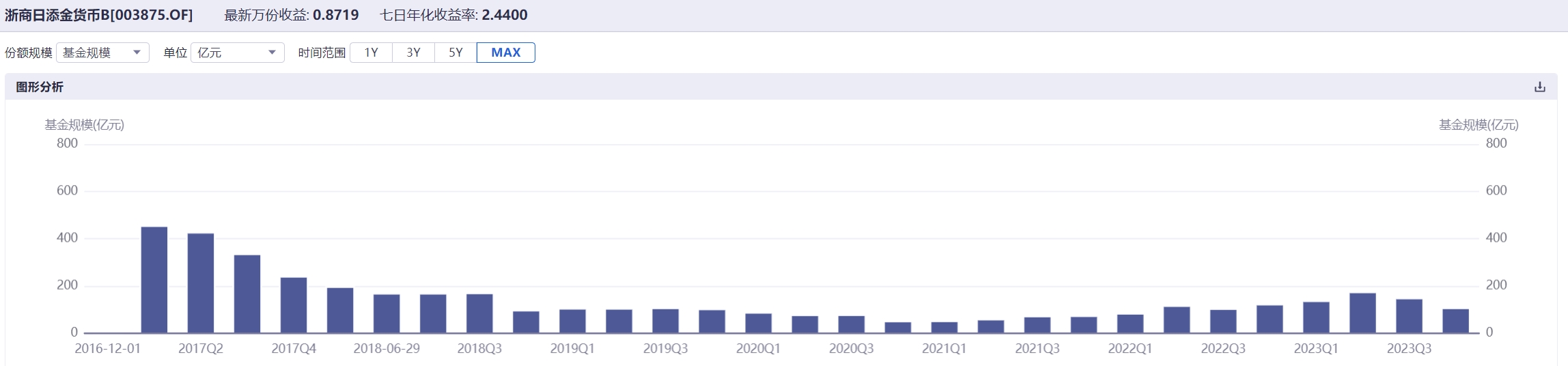 究其原因,主要还是由于浙商日添金货币基金的规模波动,其B类基金从2023年二季度末的约173亿元,降至2023年末的约106亿元,减少67亿元,占公司整体缩水规模的67%。