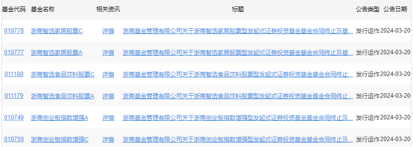 3月20日,浙商基金连续发布6条基金合同终止公告,包含了旗下浙商智选食品饮料、浙商智选家居、浙商创业板指数增强3只发起式基金。