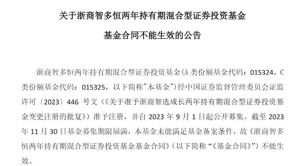 2023年12月2日,浙商基金发布公告,浙商智多恒两年持有期混合从2023年9月1日开始募集,直到2023年11月30日募集期限届满都未能满足基金备案条件,合同因此未能生效。