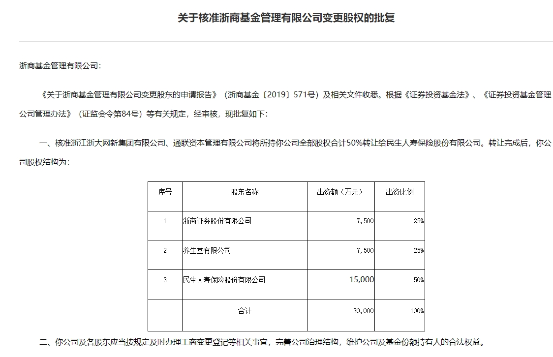 2020年1月,通联资本管理、浙江浙大网新集团将持有的浙商基金股份,合计50%转让给民生人寿,民生人寿由此成为浙商基金控股股东。