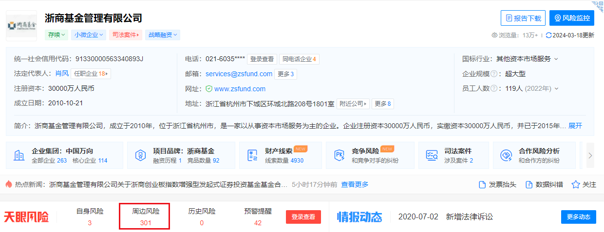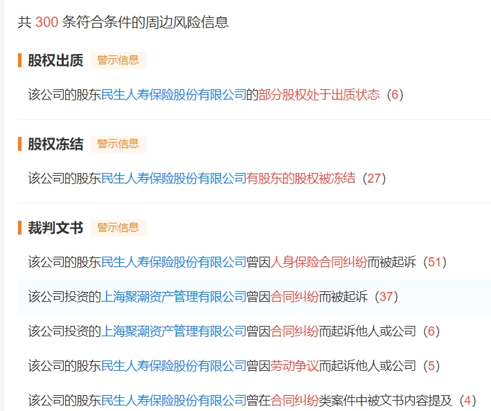 天眼查显示,浙商基金周边风险有300条,这其中大部分就来自民生人寿,包含股权冻结、质押、合同纠纷等内容。