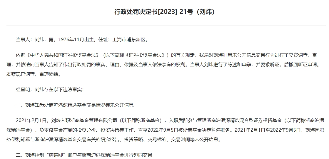 浙商基金前基金经理刘炜在任期间,利用职务之便获取未公开信息,随后控制他人证券账户进行趋同交易,2023年7月,刘炜最终被浙江证监局罚款30万元。