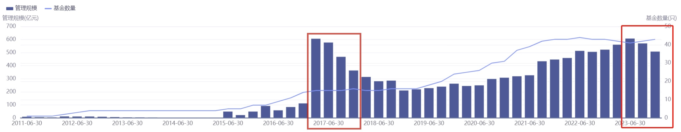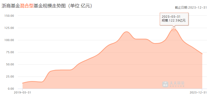 此后,浙商基金管理规模就经历了连续两个季度的下跌。截至2023年末,公司管理规模自最高点已减少100亿元。