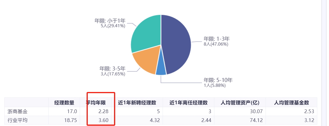 同花顺iFinD显示,浙商基金旗下基金经理平均年限为2.28年,远低于行业平均的3.6年。年限小于1年和1-3年的合计比例已超76%,并且新聘基金经理数量也大于行业平均,而管理年限超过5年的仅有贾腾一人。