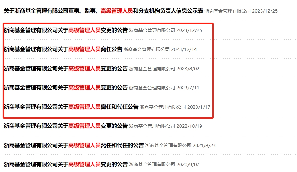 此外,2023年,浙商基金共发布5条高管变更/离任的公告,涉及首席信息官、财务负责人、督察长等职位。