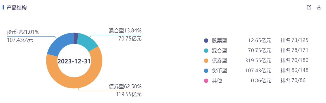 截至2023年末,浙商基金债券型、货币型基金规模分别约为320亿元、107亿元,合计427亿元,占总规模的比例达到约84%。