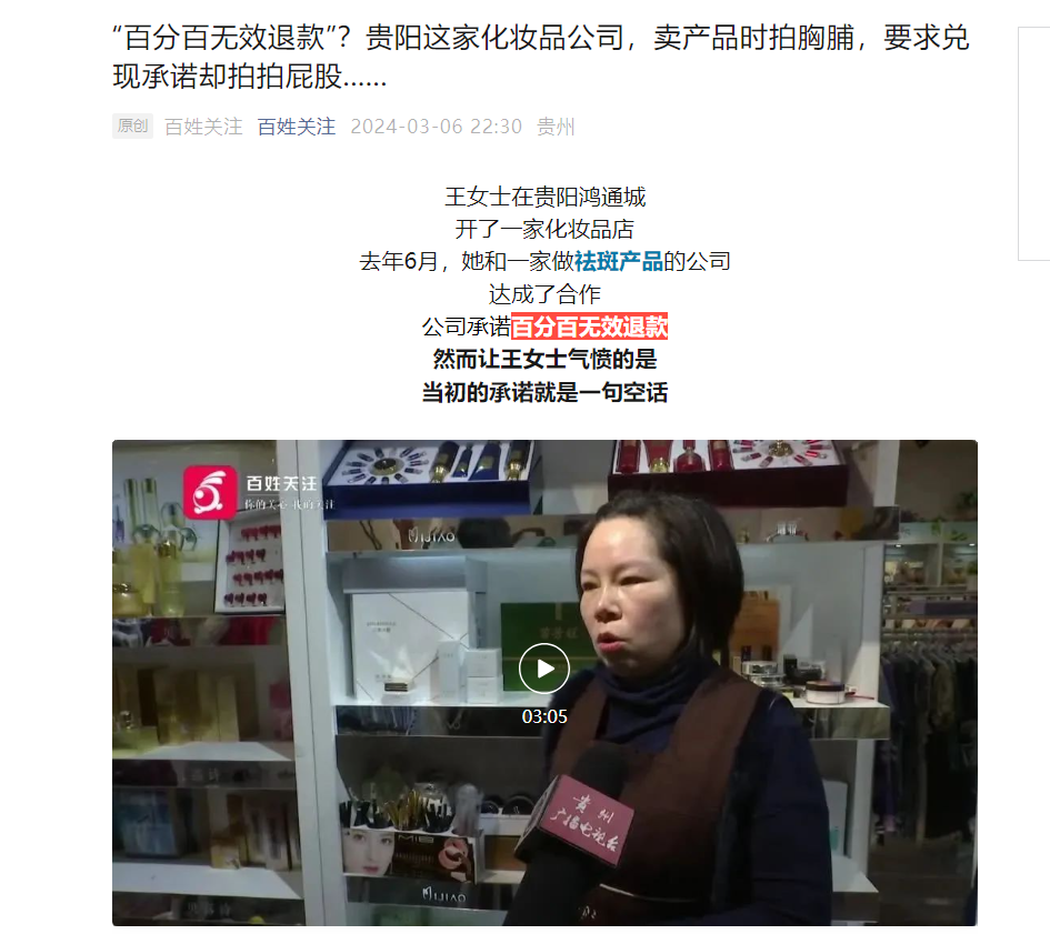 近日,贵州广播电视台2频道通过官微《百姓关注》发文,贵州贵阳某化妆品店经营者王女士从某销售祛斑产品的公司进货化妆品,但因产品毫无祛斑效果,导致不少消费者要求王女士退款。
