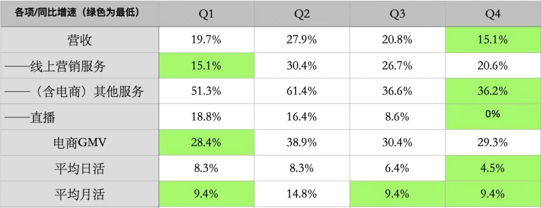 第一,快手Q4线上营销服务收入为182亿元,同比增长20.6%;第一二三季度,该数据的同比增速分别为15.1%、30.4%、26.7%。