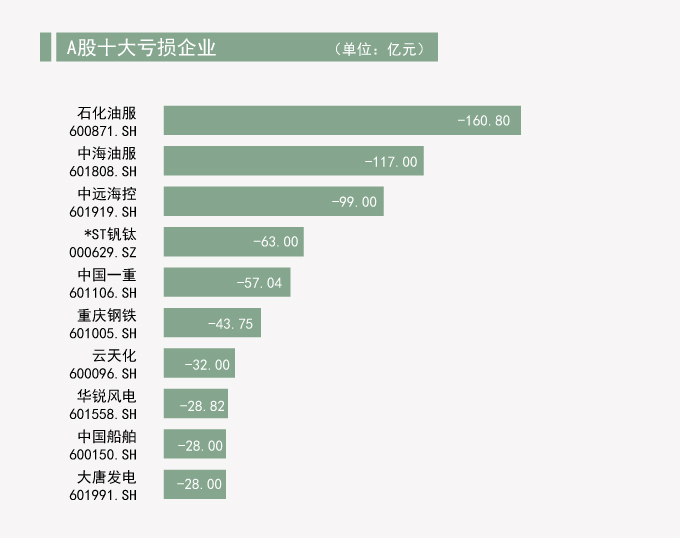 在目前已经披露业绩预告的上市公司中,石化油服、中海油服(601808.SH)、中远海控(601919.SH)等在内的10家上市公司去年亏损均超25亿元,合计预亏657.41亿元。石化油服、中海油服、中远海控更是分别以160.80亿元、117.00亿元、99.00亿元的亏损额暂列A股三大亏损企业。