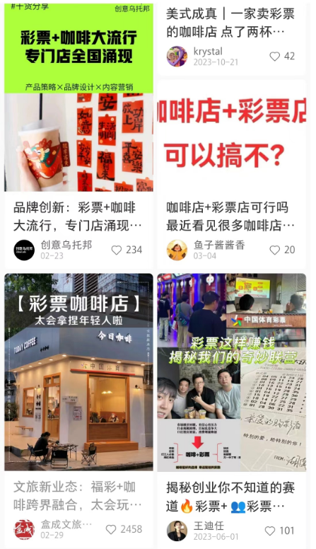 惊蛰研究所观察到,在小红书平台上,搜索“彩票、咖啡店”等关键词,除了打卡探店的笔记,还有不少探讨网红彩咖店商业模式、创业手法的内容,开一家“彩咖店”已经成为年轻创业者实现“躺赚梦”的新热点。