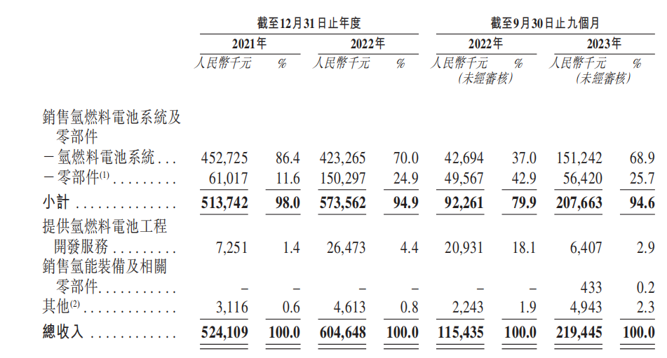目前,重塑能源收入主要来源于氢燃料电池系统以及零部件销售两部分。其中,零部件包含供氢系统、燃料电池发动机配件等。