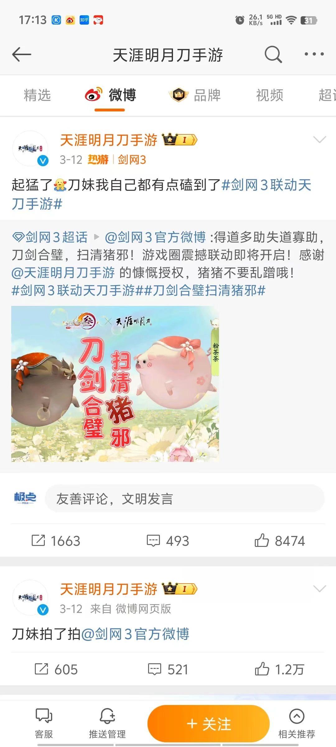 甚至,为加强联动,吸引更多用户关注,加强和玩家的情感连接,官方还不惜出面“卖萌整活儿”。比如《剑网3》联动《天刀》时说“咱们仨把日子过好比什么都强”,突如其来的操作震惊网友,称游戏界混战变成了恋爱剧……