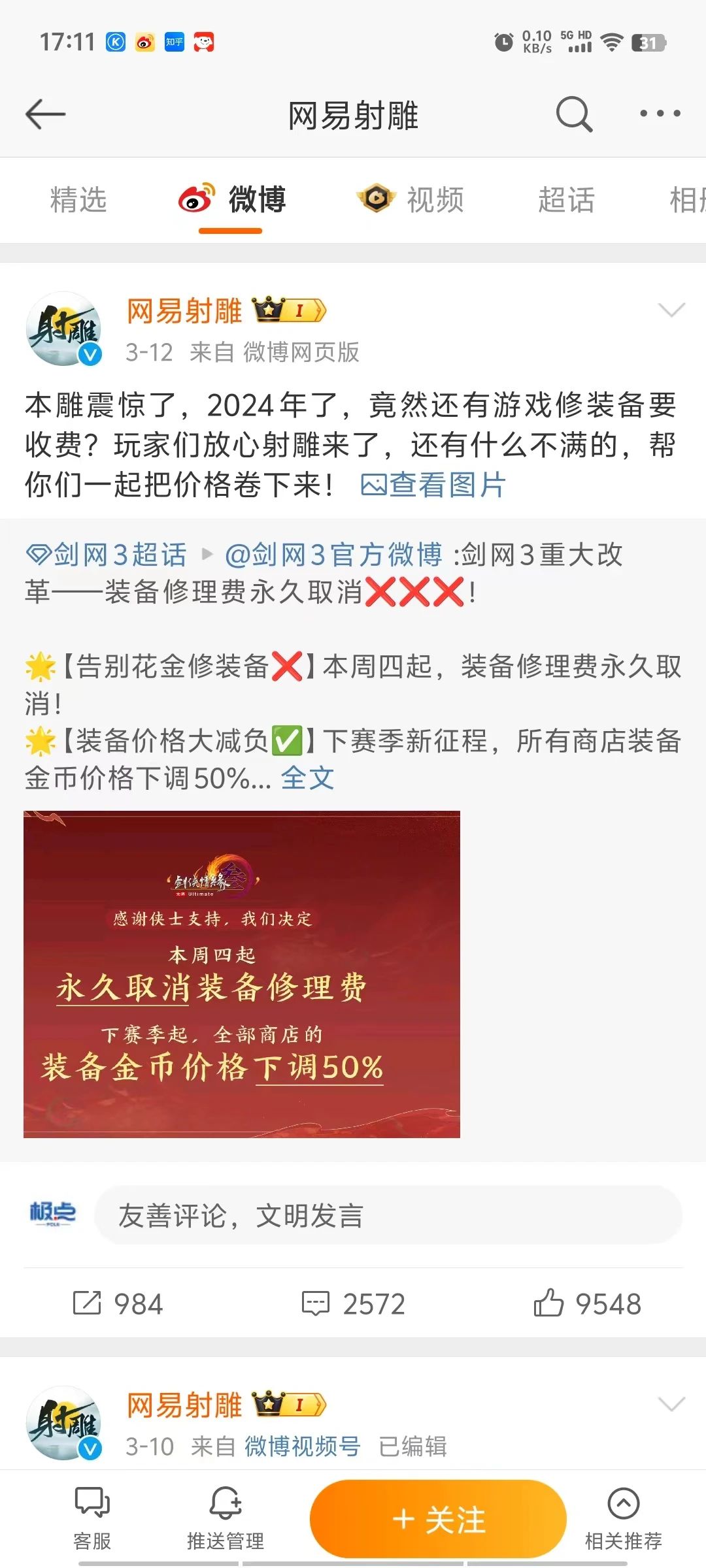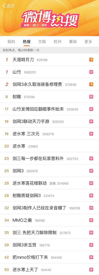 此前1天,西山居旗下《剑网3》官博宣布,要永久取消游戏内的装备修理费,并自下赛季起所有商店装备金币价格下调50%。