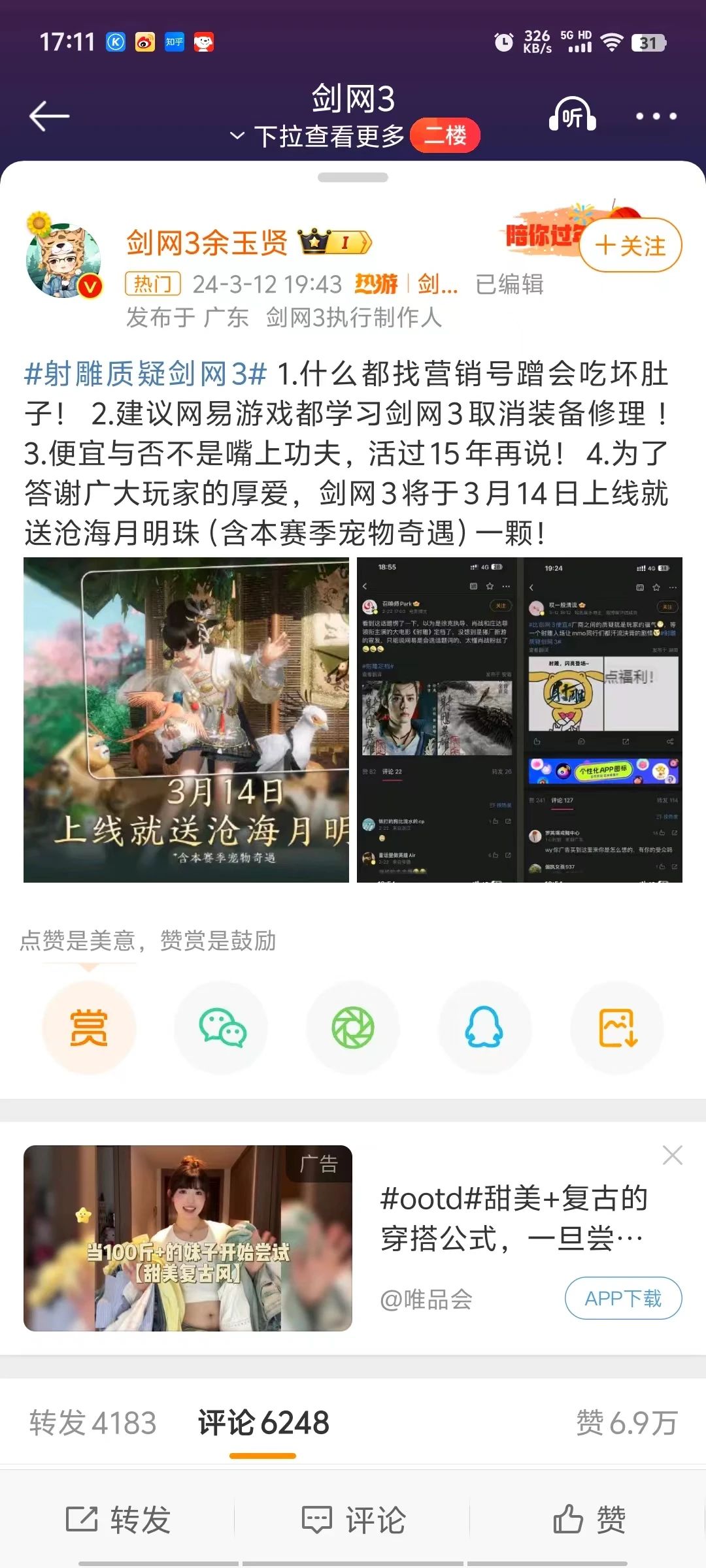 面对嘲讽,《剑网3》制作人余玉贤发博直指网易蹭热度,“便宜与否不是嘴上功夫、活过15年再说”。