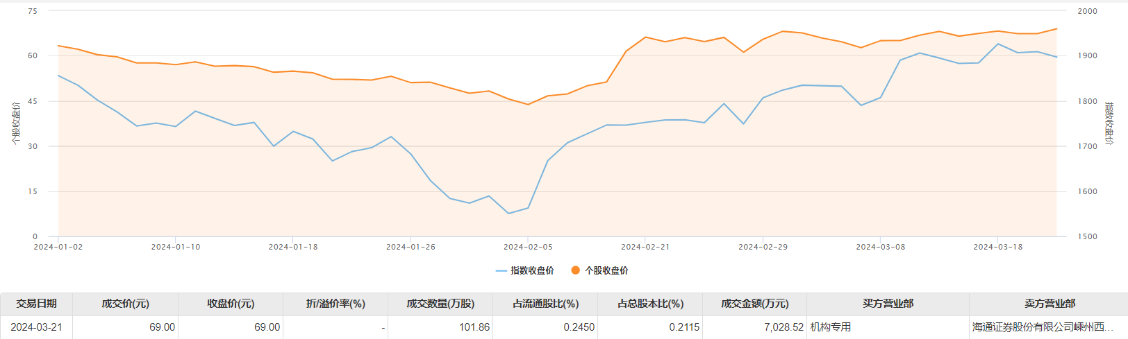 北京君正3月21日大宗交易成交101.86万股,成交额7028.52万元,占当日总成交额的4.15%,成交价69元,较市场收盘价69元持平。