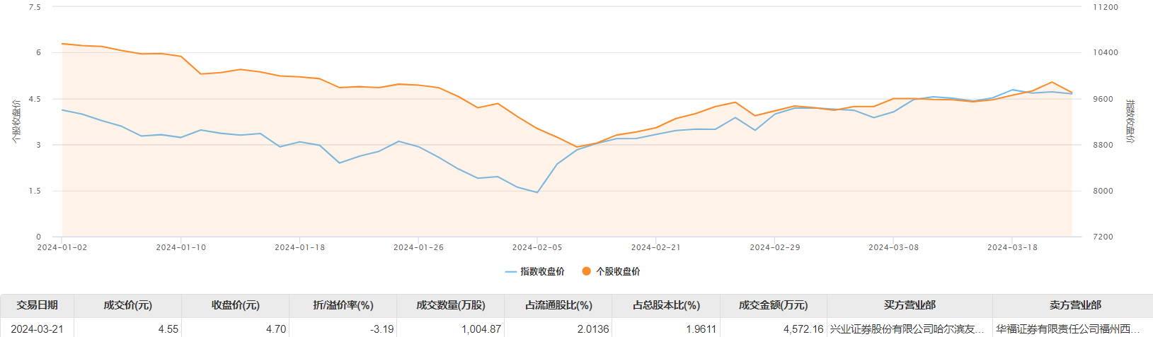 新亚制程3月21日大宗交易成交1004.87万股,成交额4572.16万元,占当日总成交额的16.87%,成交价4.55元,较市场收盘价4.7元折价3.19%。
