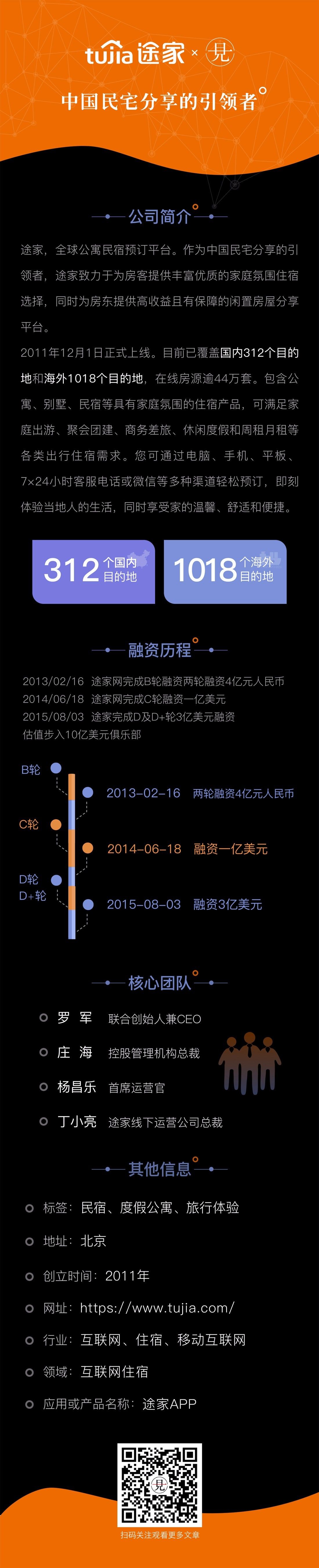 1. 行业引领者。作为中国民宅分享的引领者,途家现已覆盖国内312个目的地和海外1018个目的地,在线房源超过43万套,包含公寓、别墅、民宿等住宿产品。2015年8月3日,在宣布完成D及D+轮3亿美元融资后,途家的估值超10亿美元,正式进入“独角兽”俱乐部。