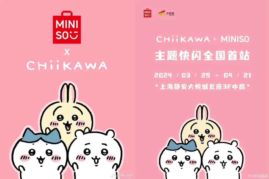近日,名创优品携手Chiikawa,推出包括玩偶挂件、大头包、U 形枕等在内的系列生活用品。据悉,此次联动将于 3 月 29 日首站登录上海静安大悦城,后续主题快闪也将开启全国巡展,为消费者带去更多联名惊喜。(SocialBeta)