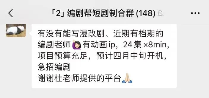 “项目预算充足,预计四月中旬开机,急招编剧。”