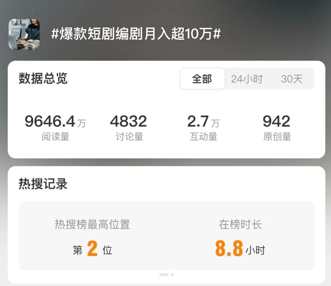 在市场趋势和政策导向的双重诱惑之下,人人都想分一杯羹。尤其在“短剧爆款编剧月入可超10万”的话题冲上微博热搜之后,越来越多普通人瞄准了“写微短剧”这门生意。