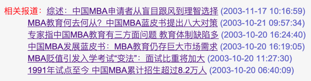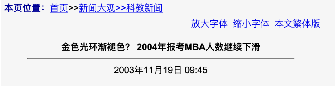 如果仔细研究1997-2022年全国MBA报名人数情况,我们会发现,报名人数在此前的2003和2015年也分别出现了“回调”,而回溯此前MBA遇冷时期的新闻资讯内容我们发现,争议点无不关于“‘MBA=高薪’、“文凭无用”的价值讨论”。