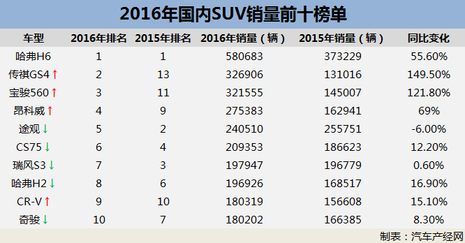 相比轿车销量榜单和MPV销量榜单,SUV销量榜单排位显得极不稳定。2016年国内SUV销量前十名里,除了冠军车型没有变化,其他排位的车型均发生改变。