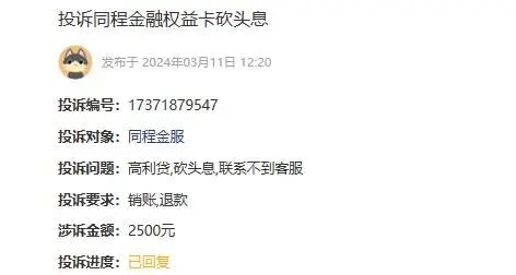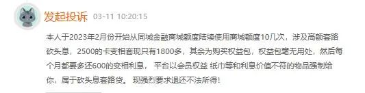 也是3月11日,投诉编号17371873133显示,一用户称,于2023年2月份开始从同程金融商城陆续使用商城额度十几次,涉及高额套路砍头息,2500的卡变现套现只有1800多,其余为购买权益包,权益包毫无用处,然后每月都要多还600的变相利息,平台以会员权益、纸巾等和利息价值不符的物品强制给你,属于砍头息套路贷。