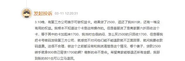 浏览黑猫投诉,类似困扰者并不鲜见。如3月11日,投诉编号17371879547显示,一用户称,3月10日晚有第三方公司表示可做权益卡,结果贷了2500元,返还了801块,还有一堆没有用的权益,根本不知道这个卡是这样操作的,但客服说商家要6折回收这个卡,等于其中的卡加起来1700……也就是说该用户贷款2500元,却只拿到801元。