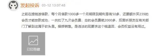 如3月12日,投诉编号17371907000显示,一用户称,之前在提钱游借款,每个月借款1000多,一个月期限到期利息有50多,还要额外买239元的会员才能放款成功,一共扣了9次会员费,总会员费就2000多……