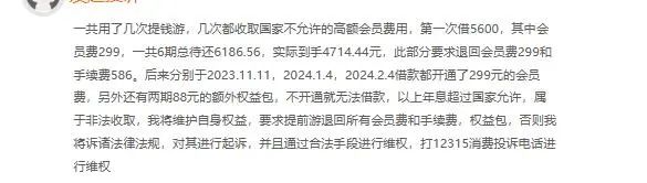 同日,投诉编号17371901622显示,一用户称,共用了几次提钱游,几次都收取国家不允许的高额会员费,第一次借5600,其中会员费299,一共6期总待还6186.56元,实际到手4714.44元……