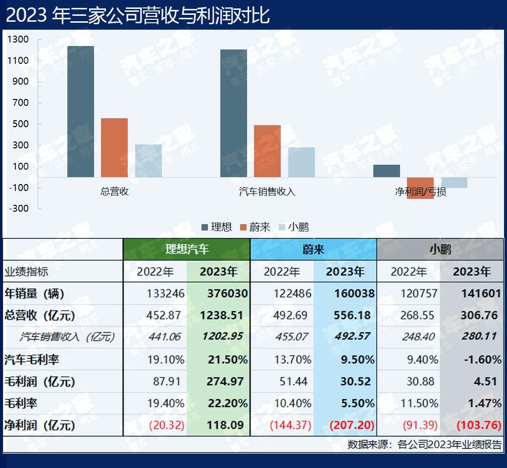 近日,蔚来、理想、小鹏都已经发布了2023年财报。数据告诉我们:理想赚钱了,并且是继比亚迪、特斯拉之后,全球第三家实现盈利的新能源车企,理想怎么做到的?蔚来真的每卖一辆车就亏3万吗?小鹏怎么把汽车毛利率干成了负值?还在继续亏钱的蔚来和小鹏,账上的钱还能撑多久?进入更难的2024年,他们手里的筹码又有多大胜算?财报里有很多的秘密,今天我们来个深度分析对比,以期发现更多端倪。