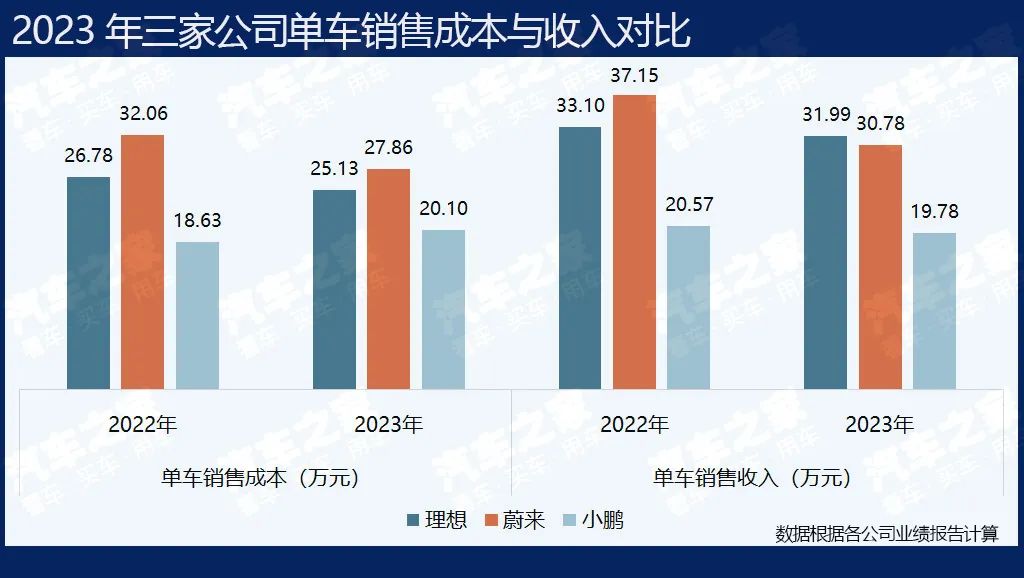 有人说“蔚来每卖一辆车就亏3万”,这有些危言耸听,在逻辑上也并不合理。事实上只看销售成本,2023年蔚来每卖一辆车能赚接近3万元(2.92万元),但是比2022年的5.09万元少了不少,产品整体售价下调导致其单车收入少了近7万元,所以尽管单车销售成本也比2022年下降了4万多元,蔚来每辆车赚的钱还是更少了。
