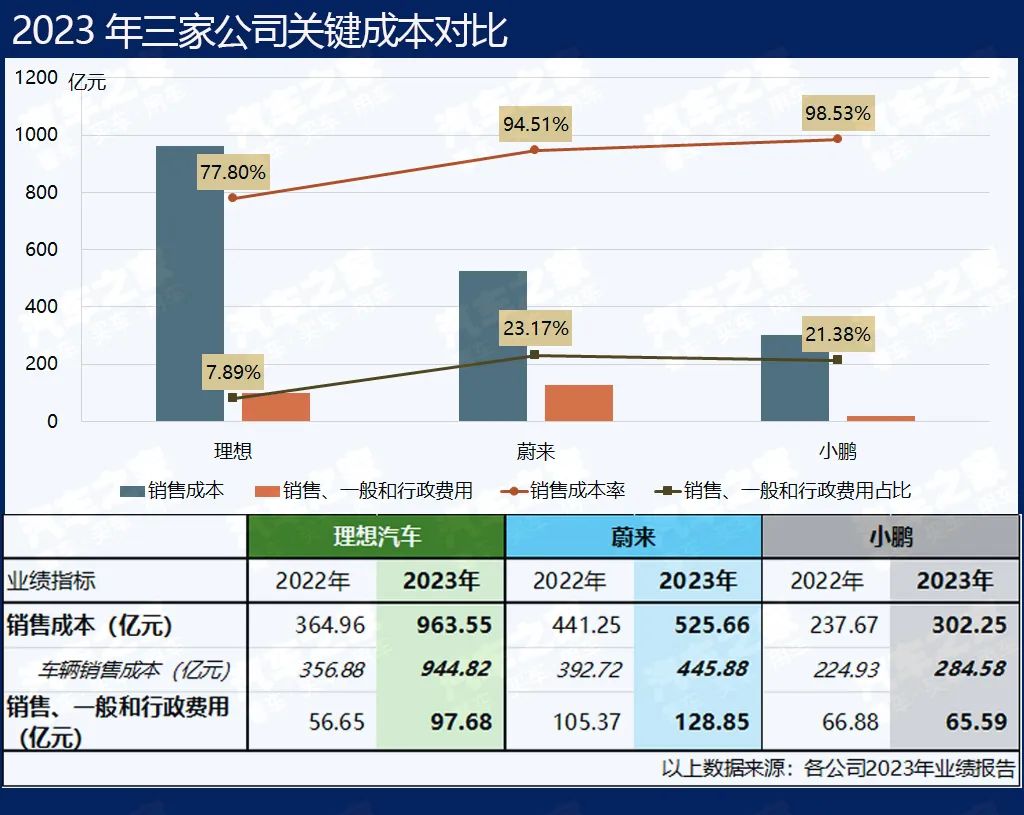 其实蔚来的销售成本去年控制不少,单车减少了4.2万,这并不容易,但是其销售成本率(销售成本/营收)还是居于94.51%的高位,比2022年还上涨了5个百分点;小鹏更高,98.53%,比2022年增加了10个百分点。两家如此高的销售成本率,盈利能力可想而知。