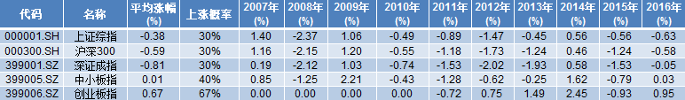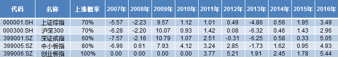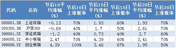 另外,从春节后10个、15个以及20个交易日来看,各大指数春节后的红包效应有所递减。数据显示,春节后10日的上涨概率而言,过去10年仅有创业板指在春节后两周内均以正收益报收,上涨概率为100%;而沪深300以及深证成指的上涨概率均仅为40%。延长到春节后15日以及20日来看,普涨的格局已经逐步消失。