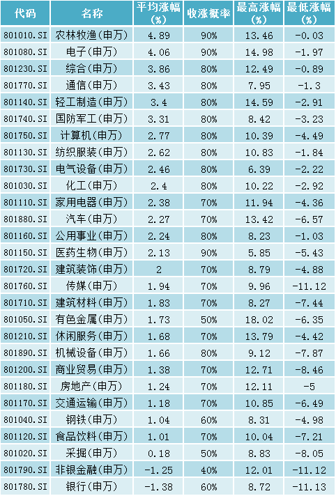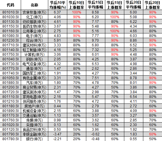 分行业而言,农林牧渔以及化工依然表现强劲,过去10年间春节后二周、三周以及四周涨幅概率均超过90%。就平均涨幅而言,农林牧渔的春节后两周平均涨幅高达6.37%,强势行情蔓延到了春节后一个月。化工板块春节后两周至四周普遍涨幅也高于4%。此外,医药生物的涨势也表现强劲,春节后两周至三周的涨幅可以期待。值得留意的是,金融以及非银金融等个股在春节后的表现一直较为疲软。特别是银行板块过去10年间,春节后一周的上涨概率仅为20%,春节后一个月内正收益的概率也仅为50%。