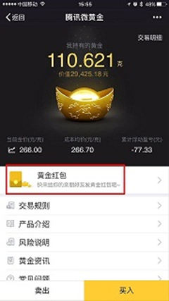 第三,比普通红包更有趣味的是黄金红包是一个价格波动的红包,可能你一夜醒来,它就增值了不少。也就是说,黄金红包的价值随着微黄金价格波动,微黄金报价跟踪上海黄金交易所价格浮动。比如今天的市场价格1克黄金相当于263元人民币,到了明天,可能就相当于270元人民币了。