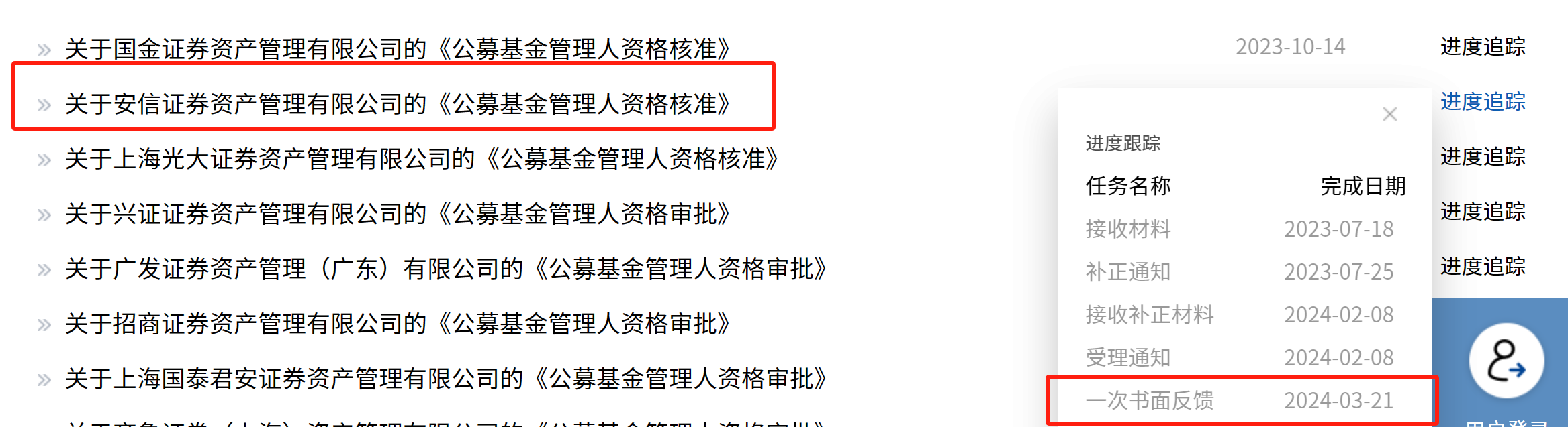 这也是安信资管在去年7月公募管理人资格申请材料获接收后的首次获得书面反馈。