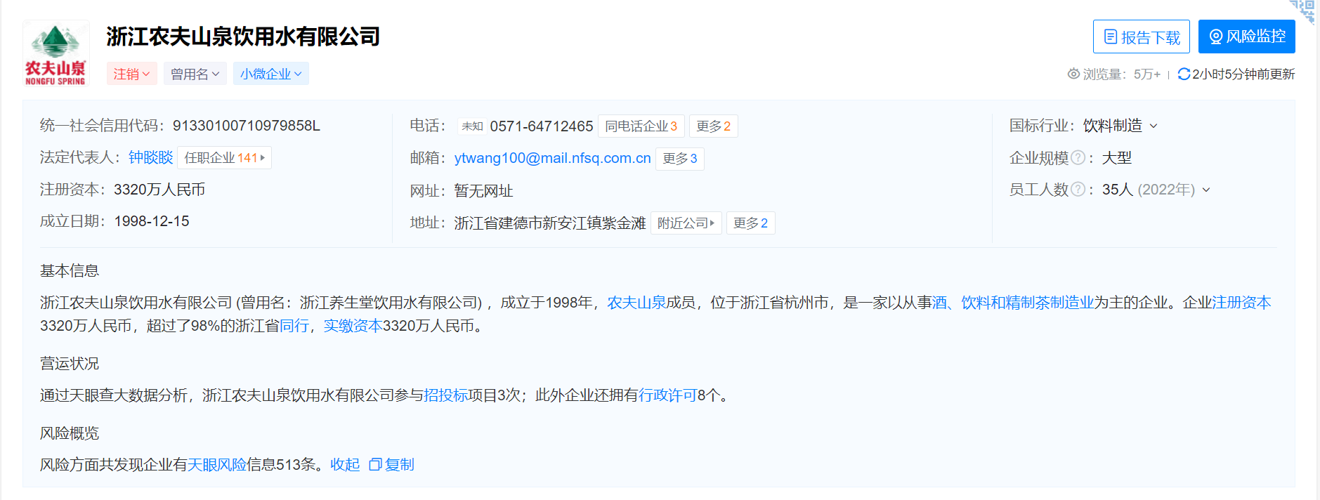 该公司成立于1998年12月,法定代表人、执行董事为钟睒睒,注册资本3320万元,经营范围含生产饮料[瓶(桶)装饮用水类(其他饮用水)]、销售自产产品、普通货物仓储服务和装卸服务等,由农夫山泉全资持股。