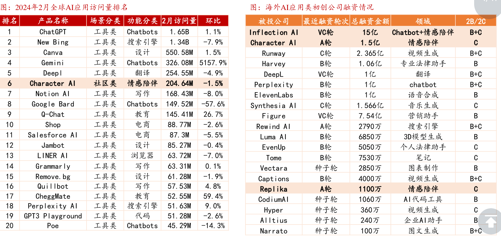 在今年2月的全球AI应用访问量排名中,Character.AI上排在第六位。在海外AI应用类初创公司融资情况里,Inflection AI以15亿美金位列榜首。