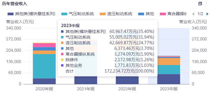 其中,气压制动系统和液压制动系统是万安科技的两大拳头产品。2023年半年报数据显示,万安科技主营的气压制动系统产品实现收入5.50亿元,占半年度总收入的31.94%;液压制动系统实现收入4.27亿元,占比半年度总收入的24.77%,同比均实现超16%的增长。